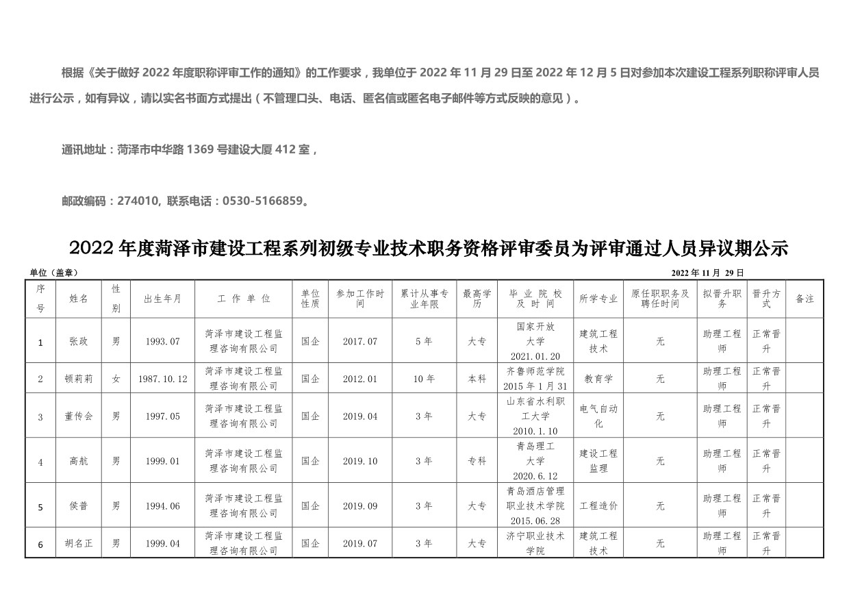 2022年度菏澤市建設(shè)工程系列初級(jí)專業(yè)技術(shù)職務(wù)資格評(píng)審委員會(huì)評(píng)審?fù)ㄟ^人員異議期公示 2023-10-18 本文被閱讀 892 次